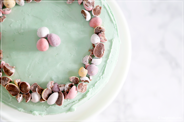 To finish the cake, place three different coloured mini eggs in the centre of the top of the cake, then crush the rest of them roughly in a pestle & mortar.