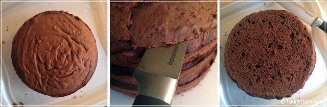 Once cooled, choose which cake will be best for the top layer, and carefully using a large knife, slice the top off this cake to square it off.