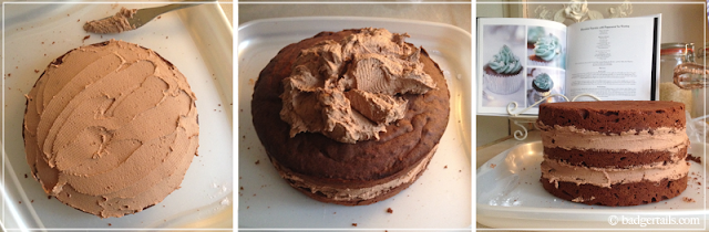 Wrap the cake in cling film and leave to stand in an airtight container for a few hours, or overnight if possible. This allows the chocolate filling to set slightly, which will make icing the outside of the cake a lot easier.